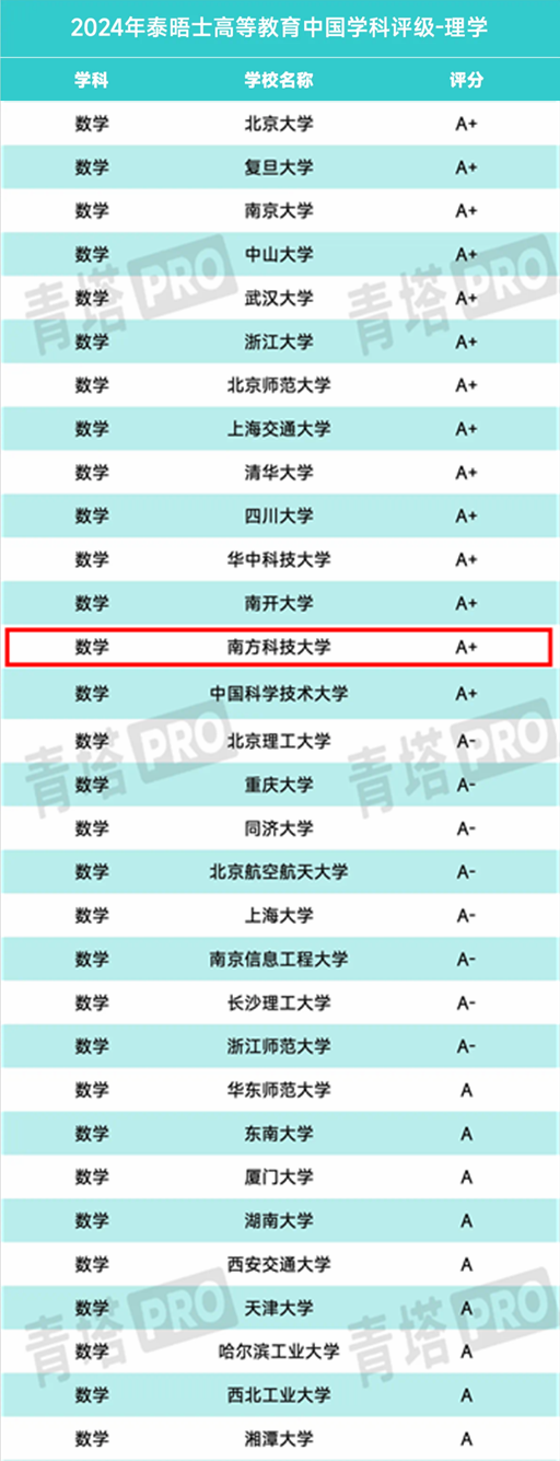 3月27日,泰晤士高等教育发布2024年泰晤士高等教育中国学科评级。据了解,2024年泰晤士高等教育中国学科评级对1885所研究型大学的83门学科进行评估,这83门学科基于中国教育部的学科分类。根据高校在教学、研究、引用、国际视野和产业收入这5个领域的表现,泰晤士高等教育对其在每门学科中进行介于A+和C-之间的评级。本次中国学科评级中,共有86所内地高校上榜,其中南方科技大学数学学科获评A+。