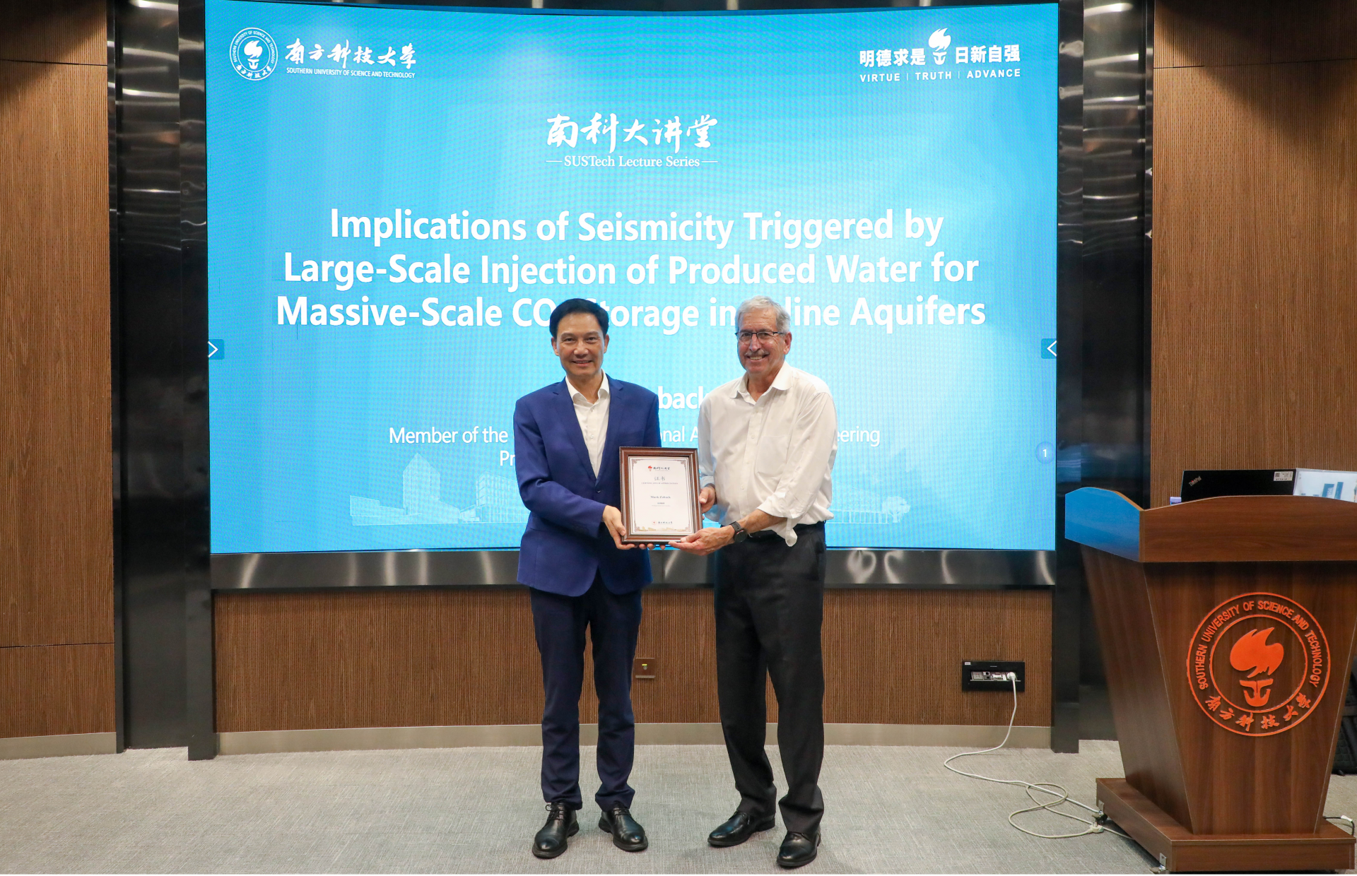 After the lecture, Professor Mark Zoback was presented with a commemorative certificate by Professor Jian LIN in recognition of this outstanding lecture in the SUSTech Lecture Series.