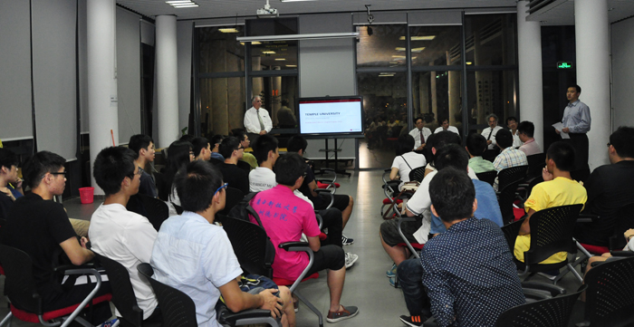 此前,14日晚上,代表团为我校学生介绍天普大学博士联合培养及3+2项目,分享天普大学的学习与生活,代表团还与感兴趣的学生进行交流。