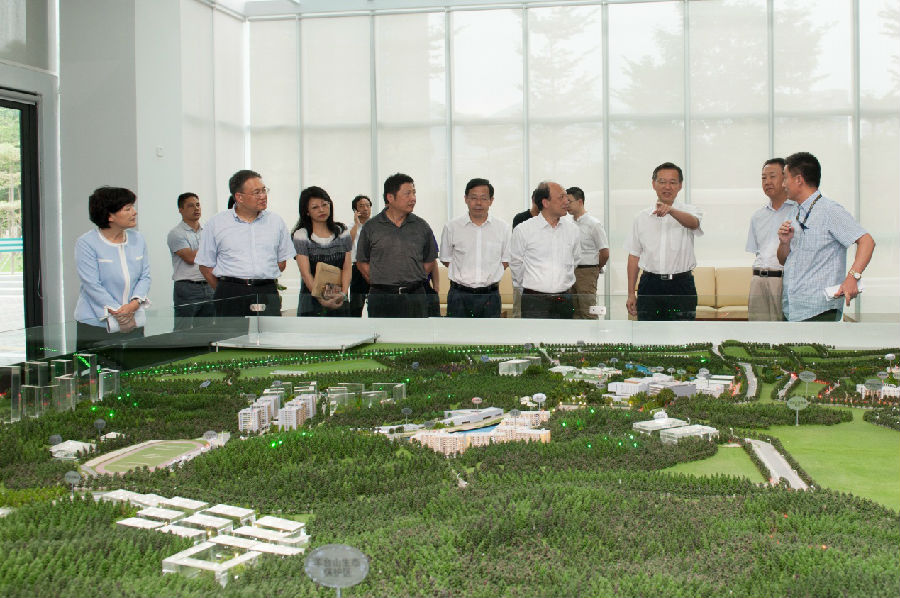 在李铭、陈十一的陪同下,姜建军一行首先参观了我校建设规划沙盘。