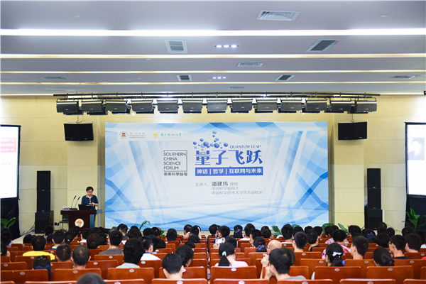 2016年5月17日下午,由我校和澳门大学合办的“华南科学论坛”第二期讲座在我校一科楼报告厅开讲。本次讲座邀请到中国科学技术大学常务副校长、中国科学院院士潘建伟教授,为我校师生作题为“量子飞跃——神话&哲学&互联网与未来”的报告,带我们走进量子的神奇世界。讲座由我校陈十一校长主持。