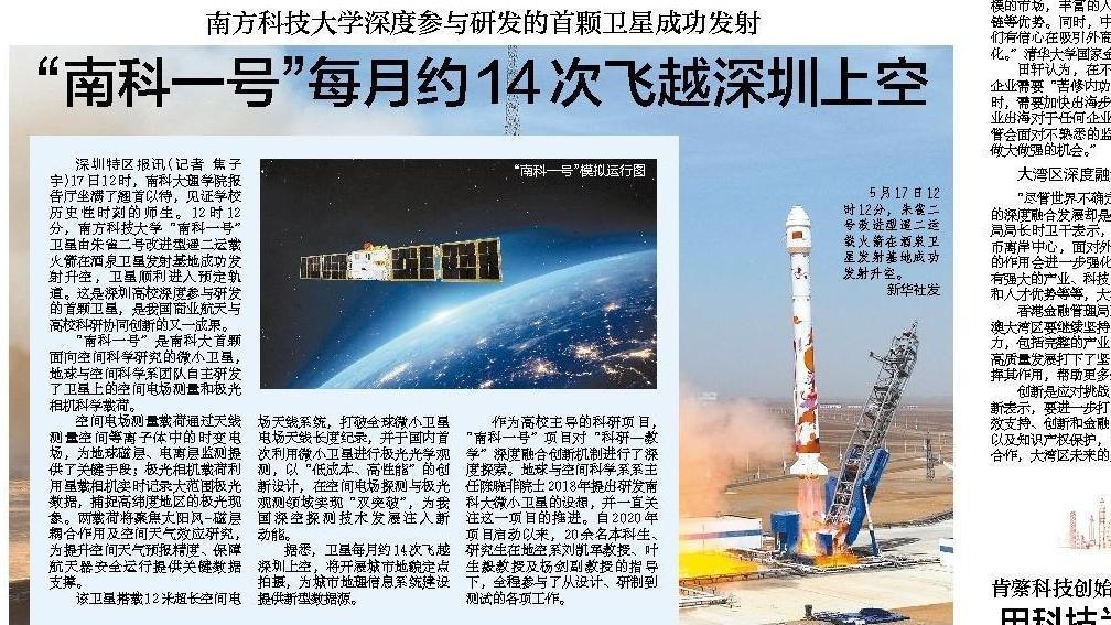 2025年5月18日,深圳特区报在A1版刊发《南方科技大学深度参与研发的首颗卫星成功发射 “南科一号”每月约14次飞越深圳上空》,对我校深度参与研发的首颗卫星“南科一号”进行报道。全文转载如下: