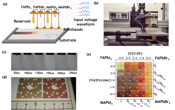 图1.(a)4通道混合打印示意图;(b)喷墨打印机实物图;(c)单液滴控制图;(d)喷墨打印钙钛矿晶体结构;(e)喷墨打印25种混合钙钛矿薄膜