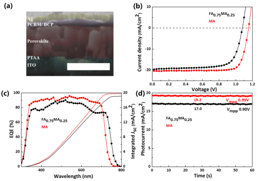 图3. (a)钙钛矿电池的SEM截面图;(b) MA和FA0.75MA0.25器件的电流密度-电压曲线;(c) MA和FA0.75MA0.25器件的外量子效率;(d) MA和FA0.75MA0.25器件的稳态输出效率