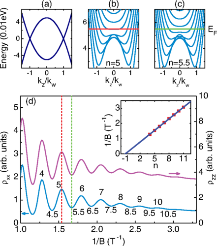 图1:拓扑半金属的能谱朗道量子化和电阻量子振荡