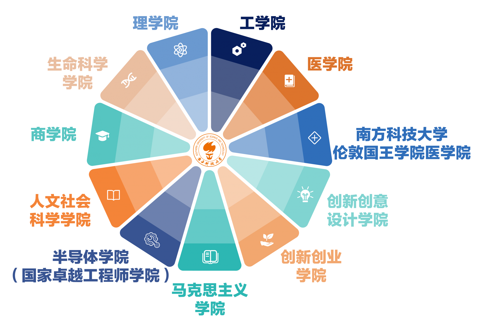 南科大面向世界科技前沿和国家重大需求,设置理学院、工学院、生命科学学院、医学院、商学院、人文社会科学学院、创新创业学院、创新创意设计学院、半导体学院(国家卓越工程师学院)、马克思主义学院十大学院,下设33个系(院)、中心,已形成以理、工、医为主,兼具商科和特色人文社科的学科布局。现有在校学生12000余人,其中本科生5000余人,研究生7000余人。率先改革招生制度,采用“基于高考的综合评价录取模式”,以综合素质、创新能力为导向,根据综合成绩选拔培养具有学科特长和创新潜质的优秀学子。